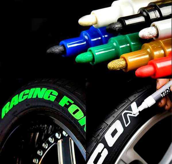 Пише по різних типах поверхні (тканина, гума, метал тощо). Маркер призначений для маркування або заповнення фарбою нанесених на шину надписів або малюнків. Швидке висихання: 2-3 хвилини.