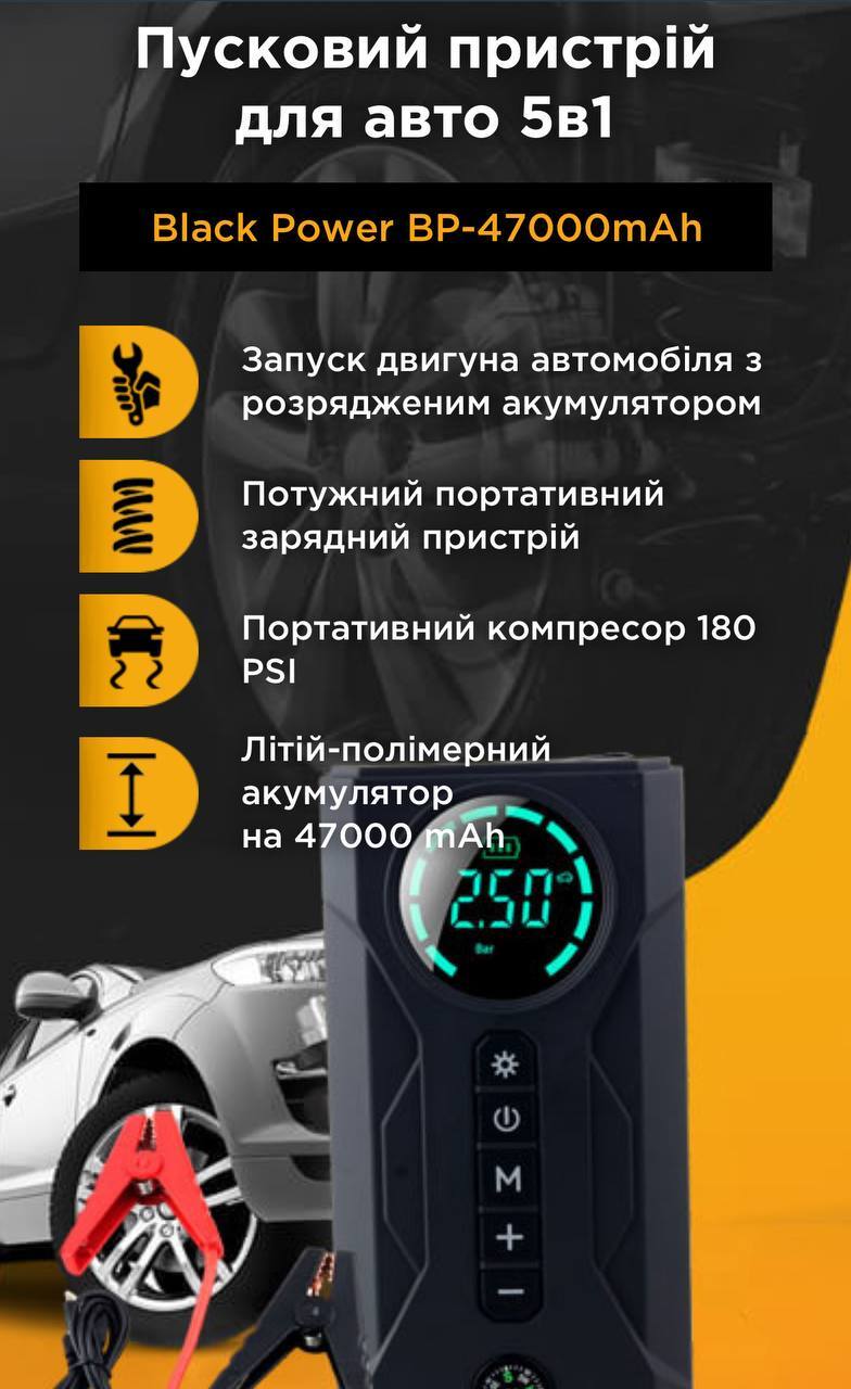 • в комплекті: основний блок, краби для підключення до акумулятора, перехідник для підкачки колес, шнур USB/TYPE-C, перехідники для різних колес (шин), чорний оксамитовий мішечок для зберігання;