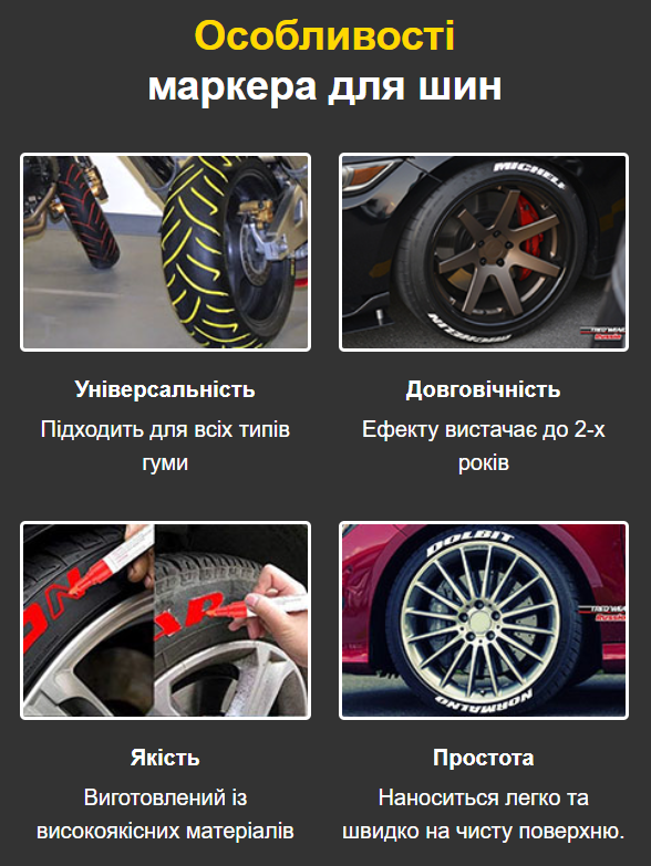 Пише по різних типах поверхні (тканина, гума, метал тощо). Маркер призначений для маркування або заповнення фарбою нанесених на шину надписів або малюнків. Швидке висихання: 2-3 хвилини.